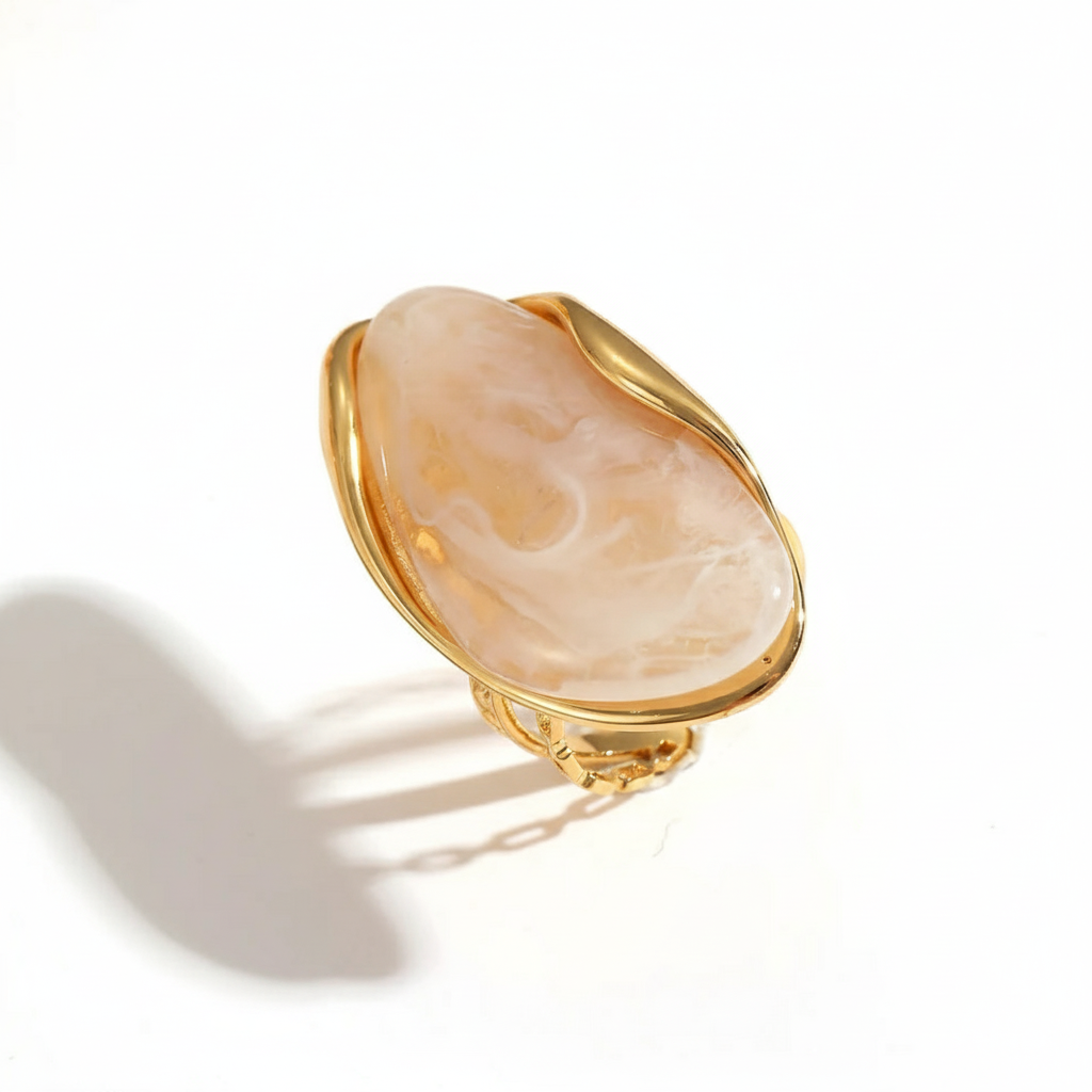 A bold, sculptural ring that captures the drama of vintage cocktail jewelry. Designed with a fluid 18k gold-plated frame cradling a luminous resin stone, each piece has the organic feel of hand-shaped artistry. Oversized yet refined, it’s made to catch the light — and attention — with every gesture. Adjustable for a comfortable fit, the Aurora Ring layers beautifully with bangles or stands alone as a striking statement.