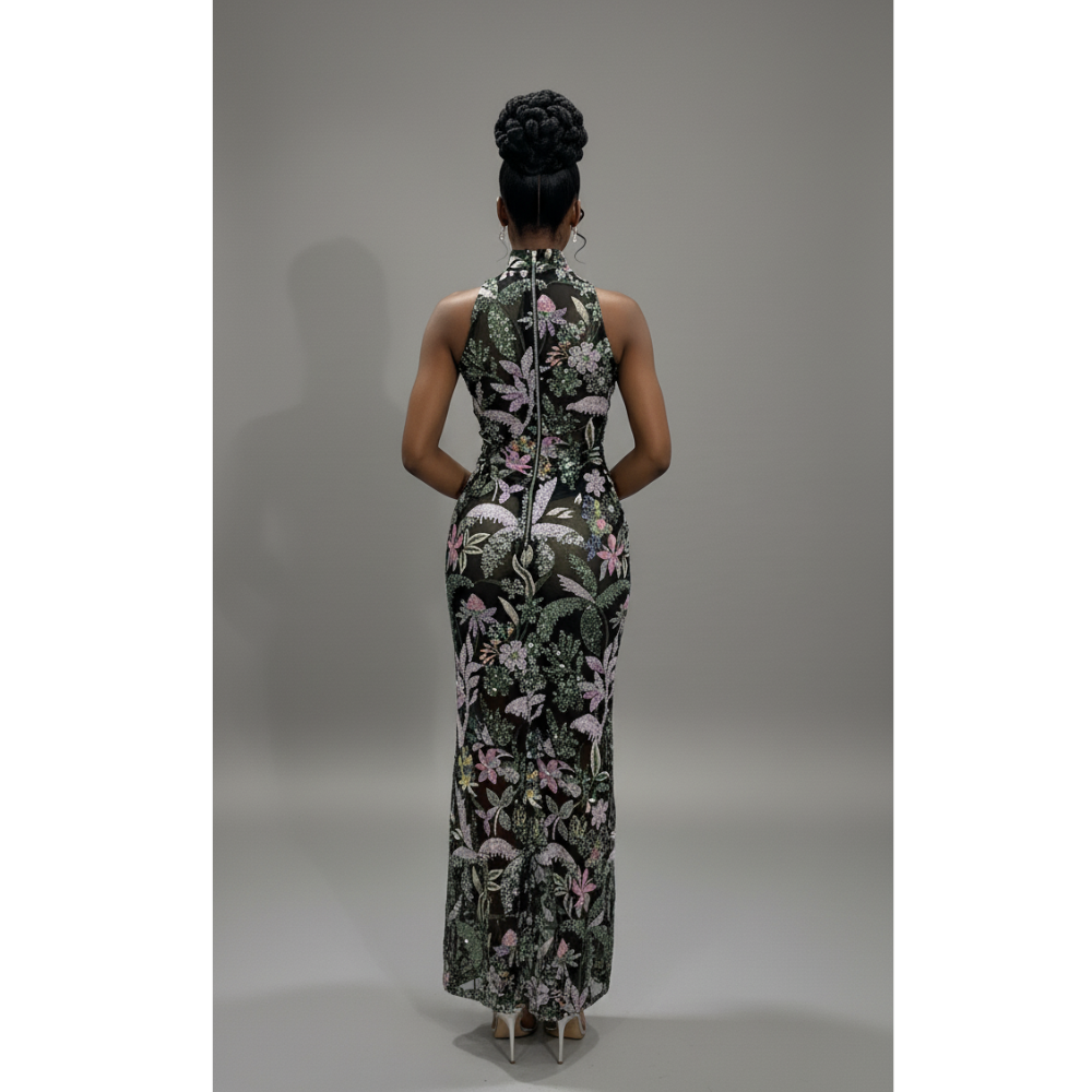Designed for formal evenings, red carpet moments, and high-end celebrations. The sequin florals create a painterly effect, making this gown an instant centerpiece for the season.