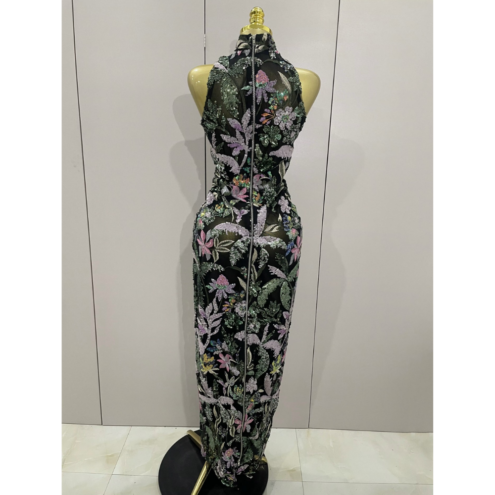 An elevated statement gown defined by intricate floral embroidery and layered sequin appliqué over sheer black mesh. The design contours the body with a sculpted halter neckline and full-length double zipper along the back for ease and adjustability. Each sequin motif catches the light for a dimensional, high-glamour finish.