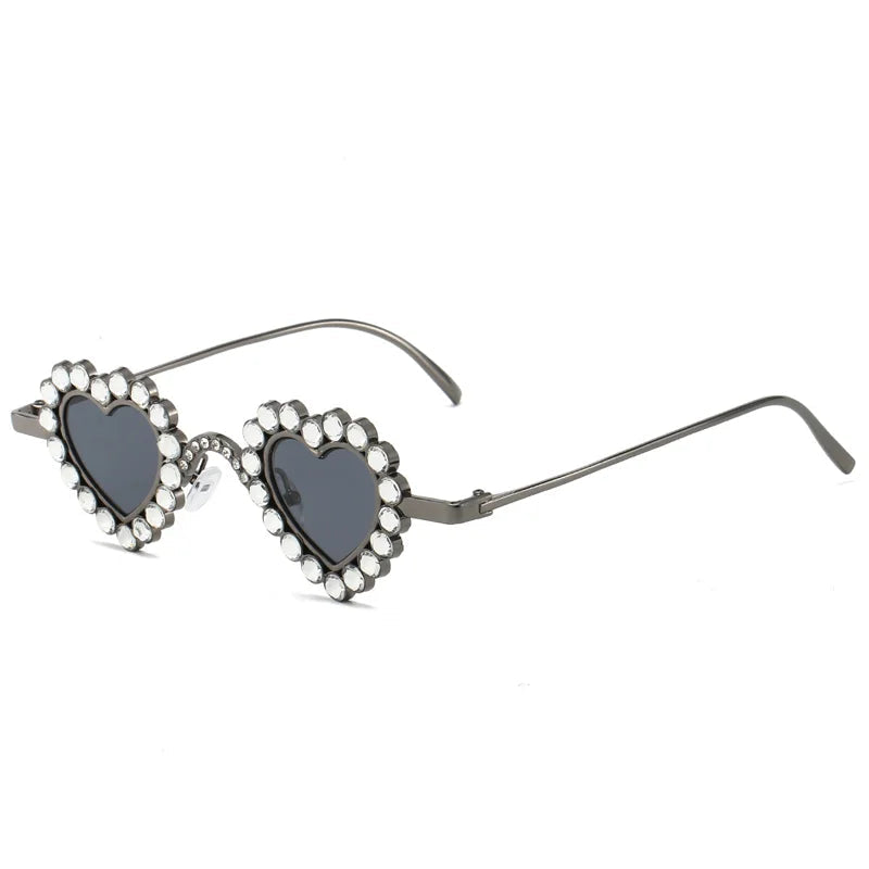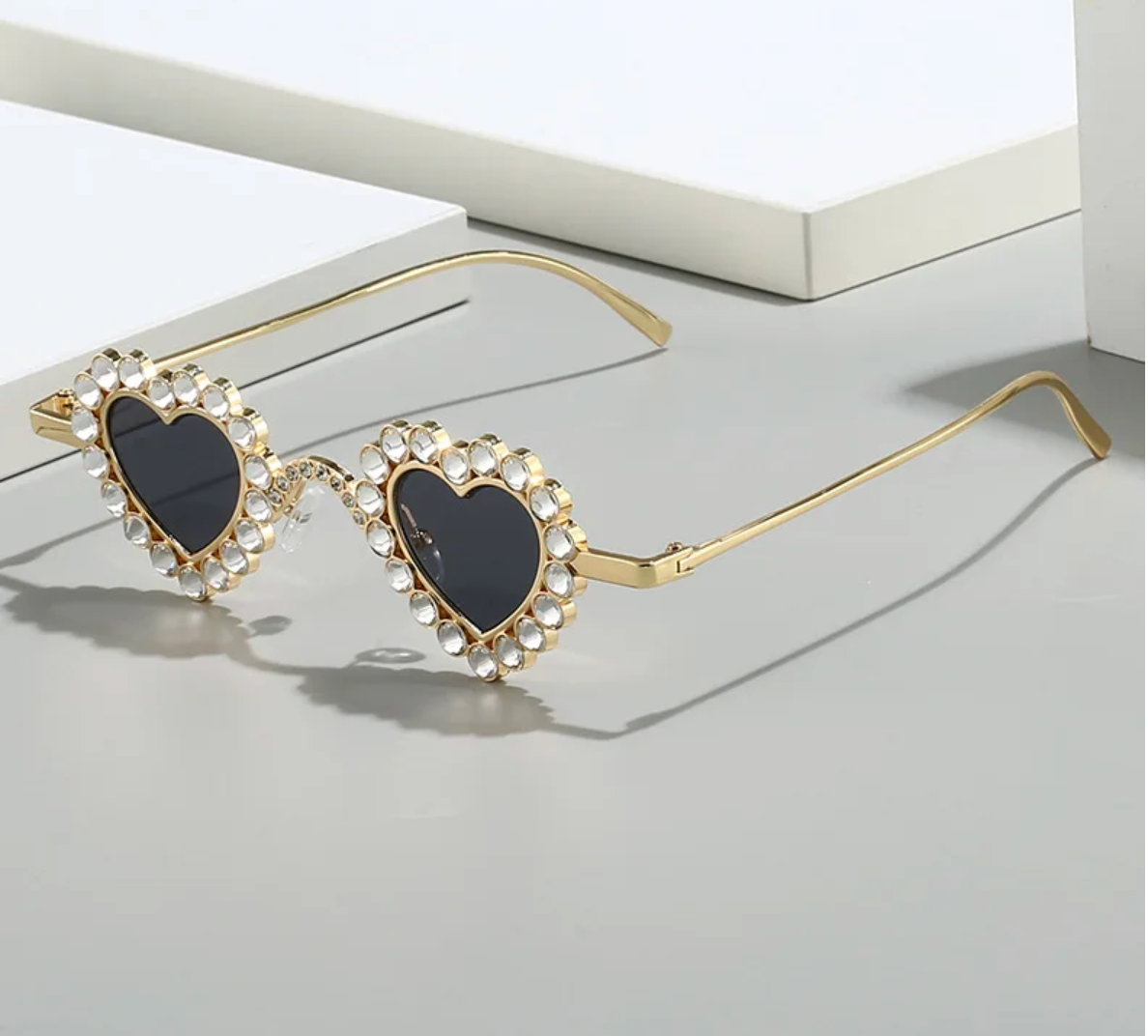 Heart-shaped sunglasses with crystal rhinestone trim and slim metal frame. Mid-size fit—not oversized—for a chic, comfortable look. UV400 gradient lenses offer sun protection. Lightweight and perfect for everyday glam, festivals, or statement outfits.