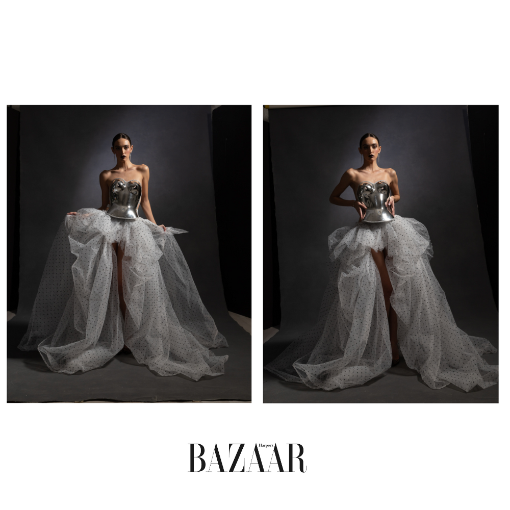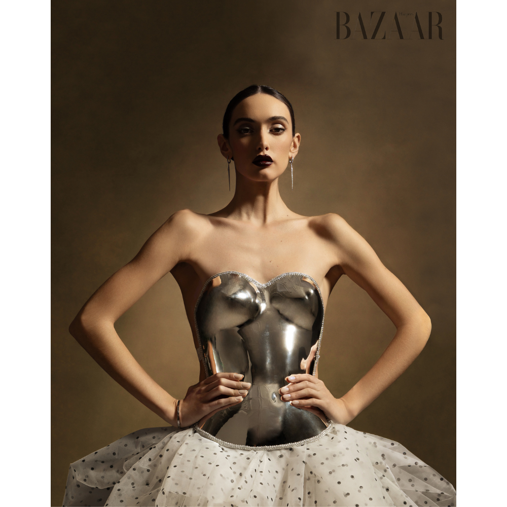 This sculpted metallic bodice is designed to command attention, blending armor-like structure with sleek couture lines. The high-shine silver surface is crafted from lightweight, molded plastic, shaped into a contoured bustier with a sweetheart neckline and defined bust cups. Its mirror-like finish catches and reflects light dramatically.