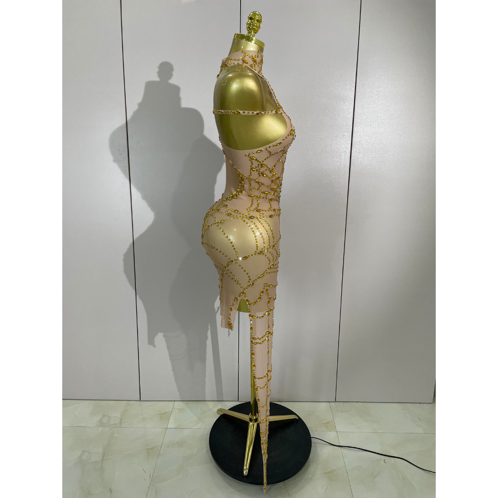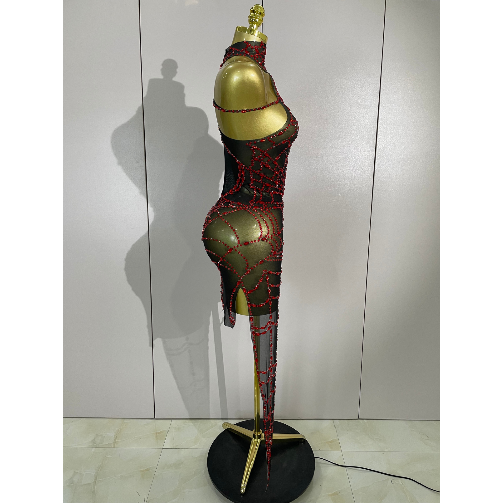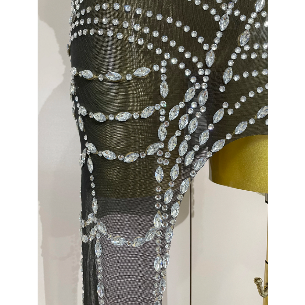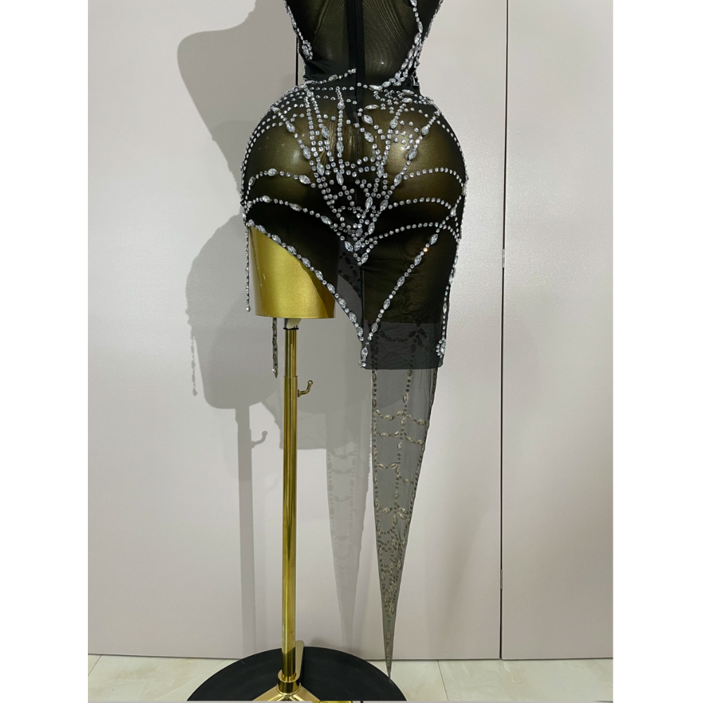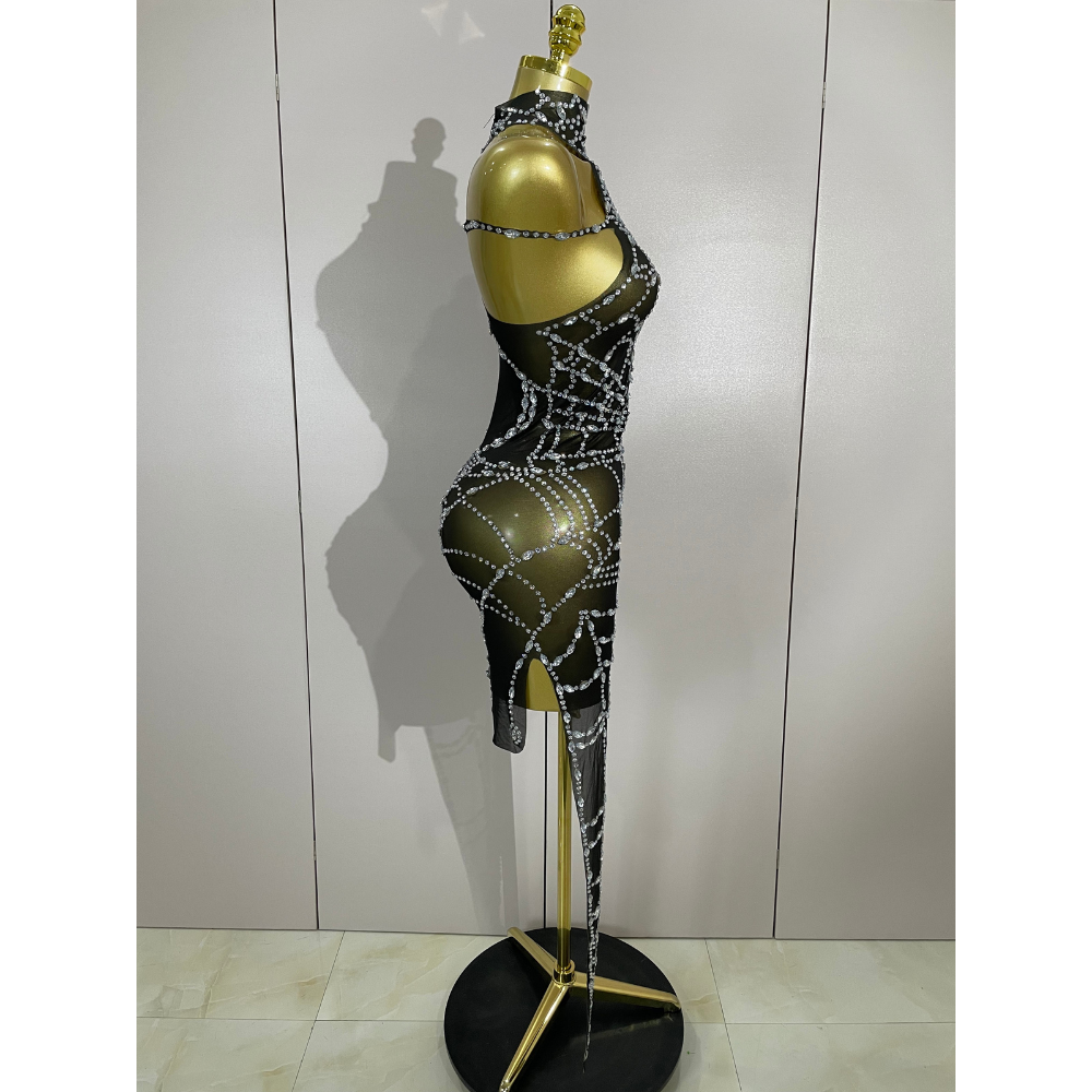Cut for impact, this sheer black mesh mini hugs the body with a sculpted, halter high-neck and racerback, then drops into an asymmetric dagger hem that elongates the leg. Thousands of silver-tone, crystal-like rhinestones are hand-appliquéd in webbed, diagonal lines to carve out an hourglass effect with high sparkle. The dress is made from stretch polyester-spandex mesh for a slim, flexible fit and finishes with a concealed back zipper. Color: black mesh with clear/silver rhinestones. Silhouette: bodycon sheath. Length: mini with extended side panel.