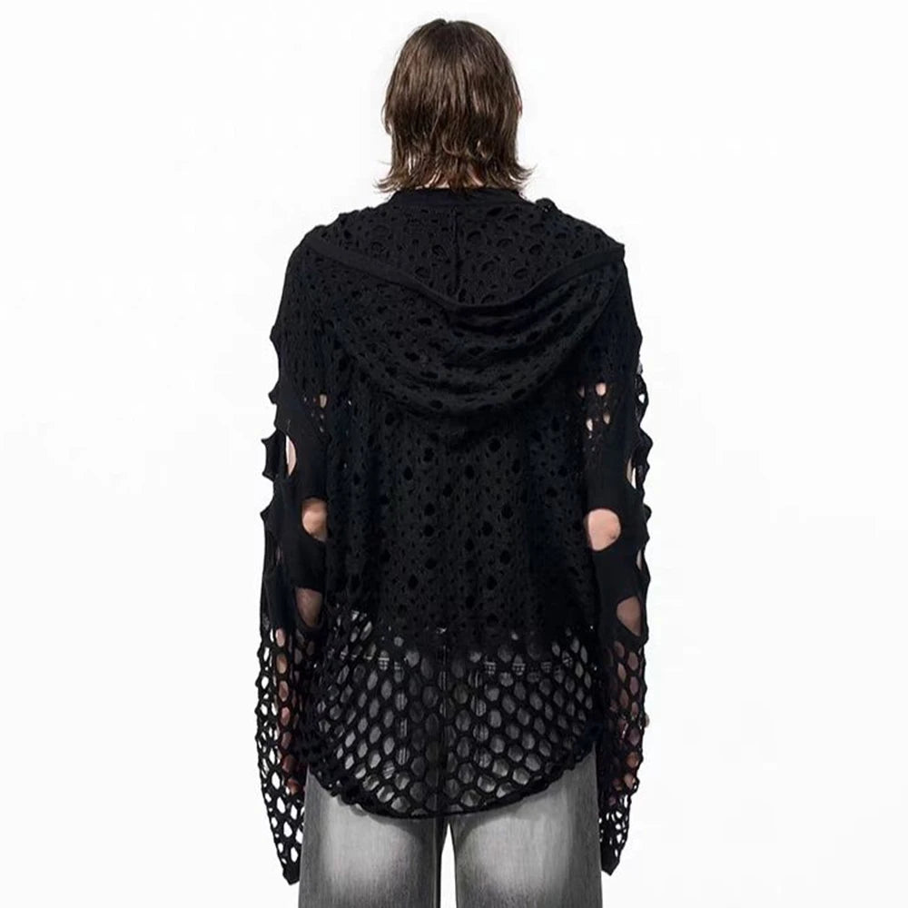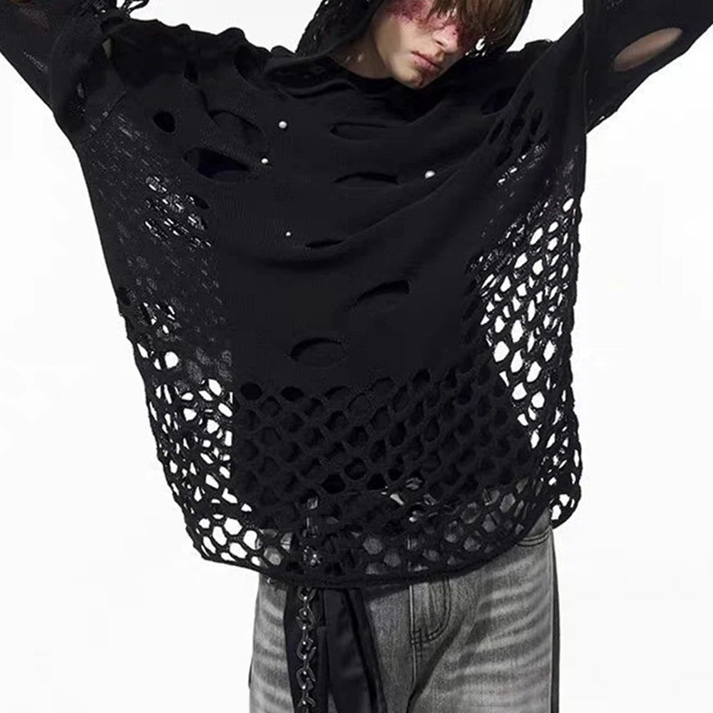 Features: Oversized cutout holes, fishnet mesh panels, attached hood, pullover style