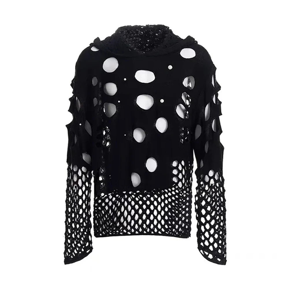 A bold fusion of deconstructed streetwear and high-fashion edge, this hooded long-sleeve features oversized cutout holes paired with wide fishnet mesh panels at the hem and sleeves. The relaxed fit drapes effortlessly while maintaining structure, creating a layered, breathable effect that works for both day and night styling. Crafted from lightweight knit fabric with subtle stretch, it offers comfort with a statement silhouette. Finished in solid black for versatile pairing with denim, leather, or layered over bare skin for maximum impact.