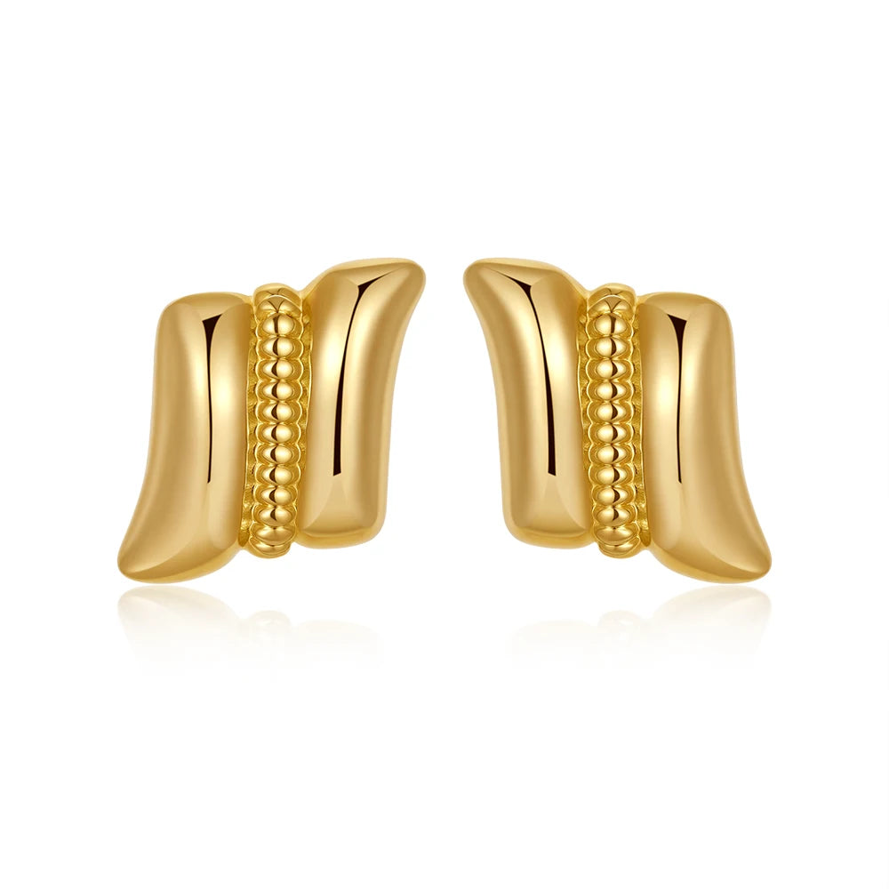 Crafted in stainless steel with gold and silver plating, these vintage-inspired earrings feature sculptural forms and textured finishes. Each pair is designed for pierced ears, offered in both stud and huggie styles for secure wear. Shapes include twisted circles, ribbed bars, geometric squares, and fluid wave motifs, all polished to reflect light with dimension. Lightweight yet durable, the stainless steel base ensures longevity while the plated surfaces give a refined, metallic shine.