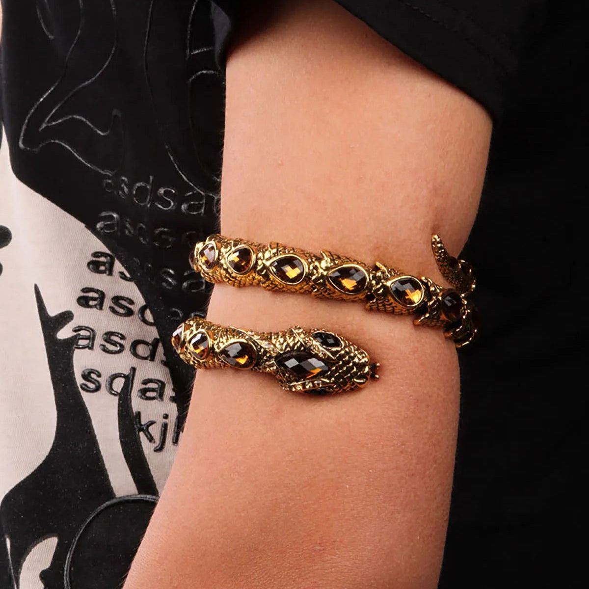 This sculptural cuff wraps the arm in a powerful serpent motif, detailed with hand-set faceted crystals along each curve. Cast in antique gold–plated zinc alloy, the bracelet mimics the scaled texture of a coiled snake, complete with a textured head and faceted crown centerpiece. The stretch-fit design hugs comfortably and adjusts with movement, making it wearable on the forearm or upper arm. An unapologetically bold statement piece for those drawn to symbolism, edge, and artful glamour.