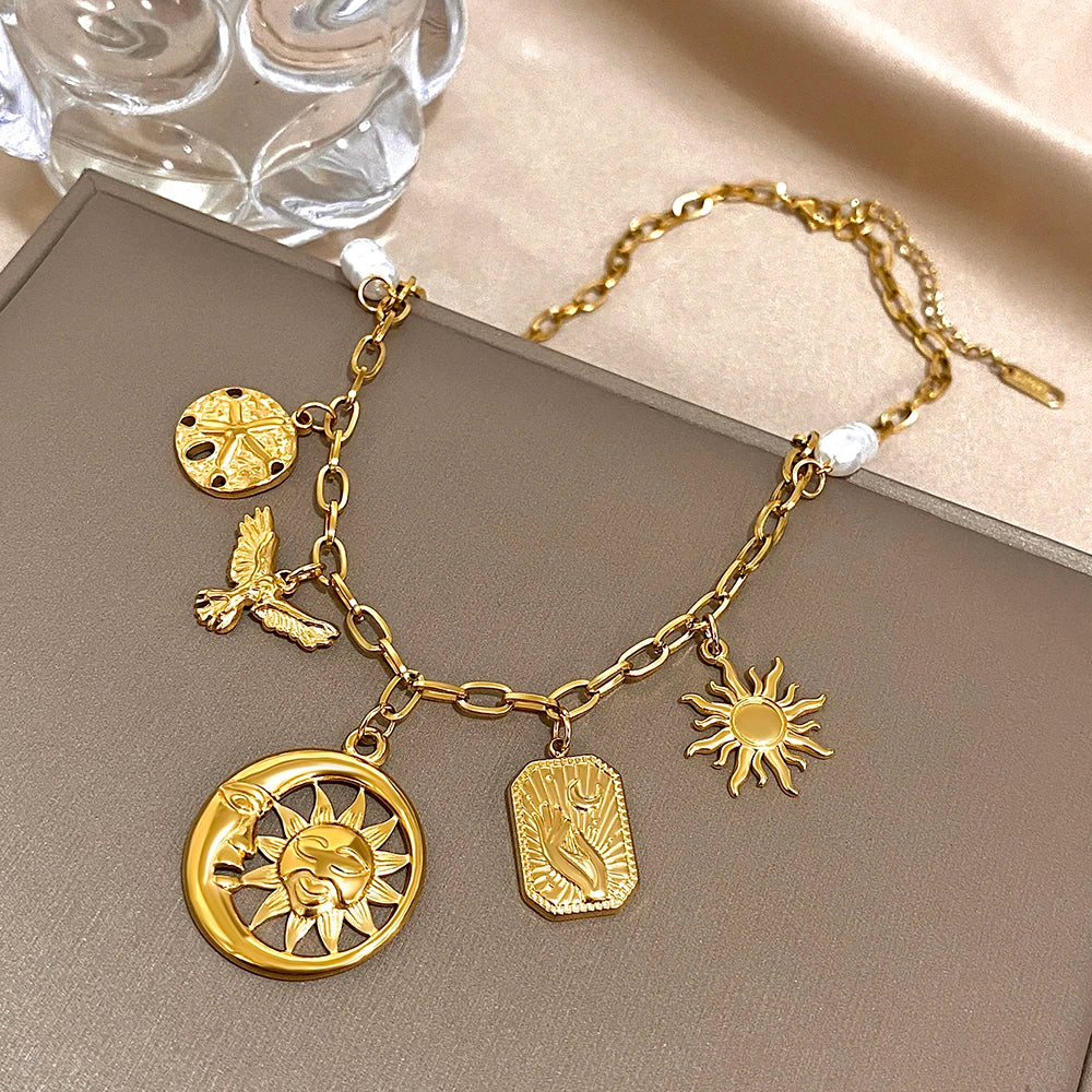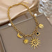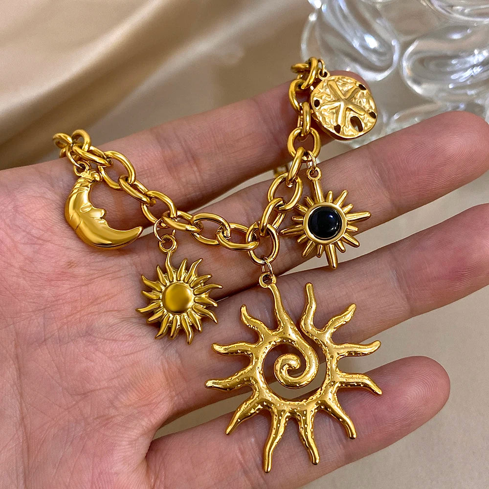An eclectic mix of celestial-inspired charm necklaces, each strung on a bold gold-tone chain and adorned with sunbursts, crescent moons, and symbolic medallions. Charms range from smooth domed suns to spiraled rays and midnight-black sun centers, all finished with rich metallic luster for a vintage-luxe look.
