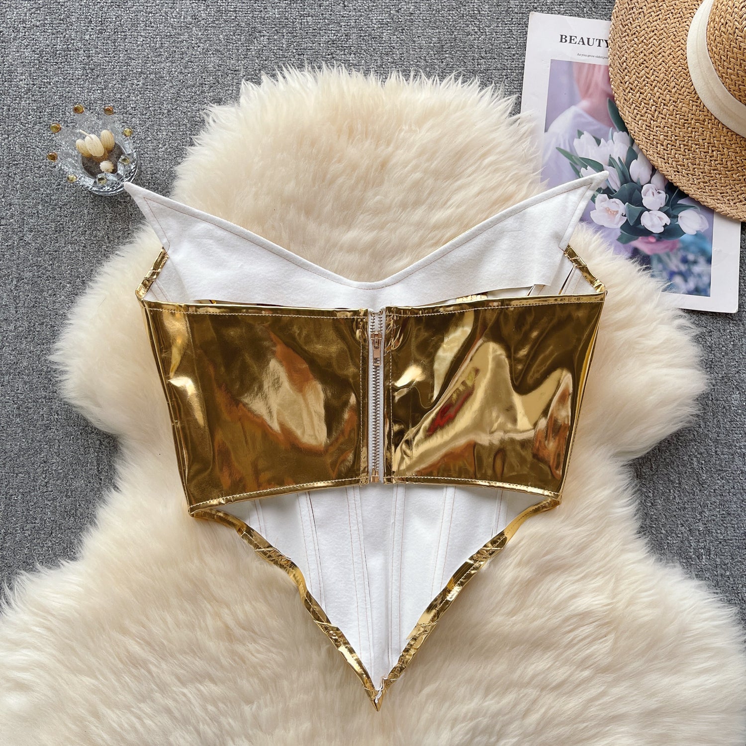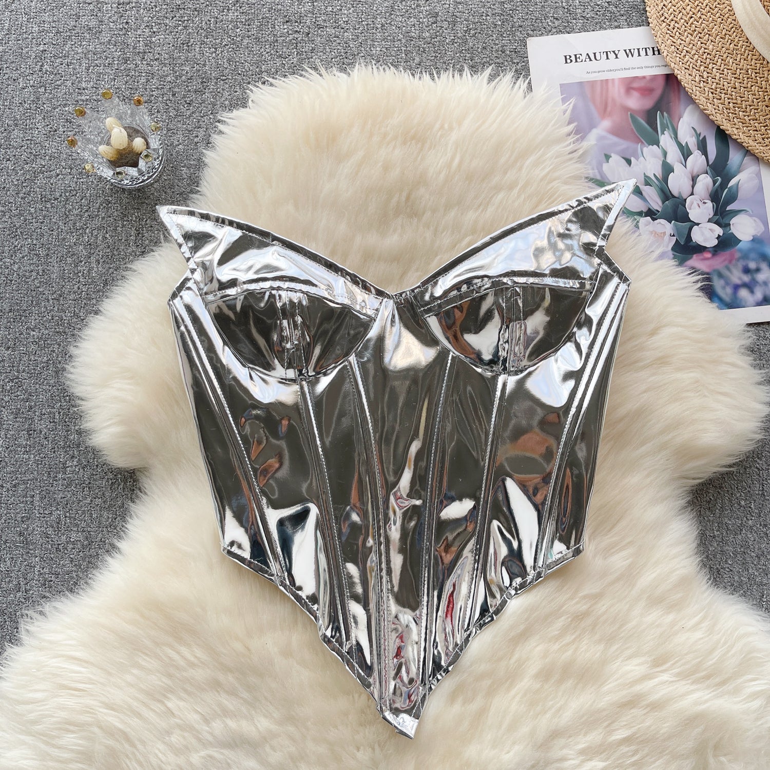 A structured metallic corset crafted from mirror-finish PU with a sculpted bustline and exaggerated angular hem. The fabric has a firm, molded hand feel—lightly flexible but not stretchy—creating a sharp, architectural silhouette that sculpts the torso. Soft interior lining provides comfort against the skin, while vertical seams with internal boning enhance shape and support.