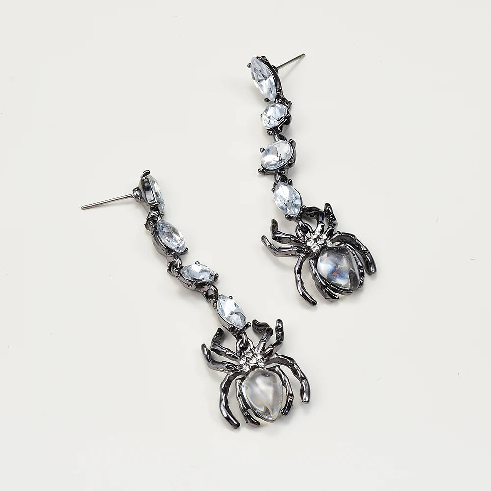 Bold scorpion drop earrings crafted in zinc alloy with a dark gunmetal finish. Featuring a faceted marquise crystal body, pave rhinestone legs and claws, and a stacked crystal bead drop for extra sparkle. Stainless steel posts for durability. Perfect for gothic fashion, punk styling, parties, festivals, and Halloween looks.